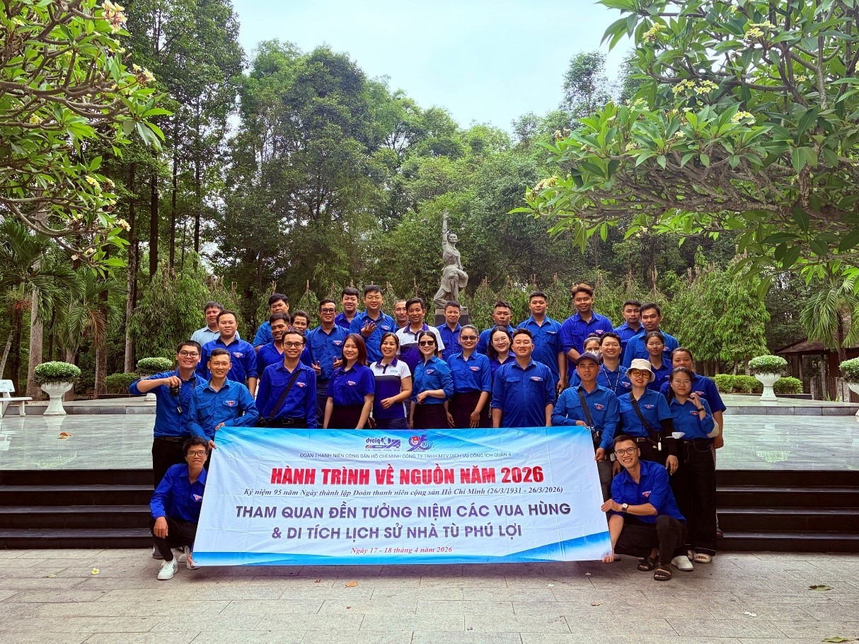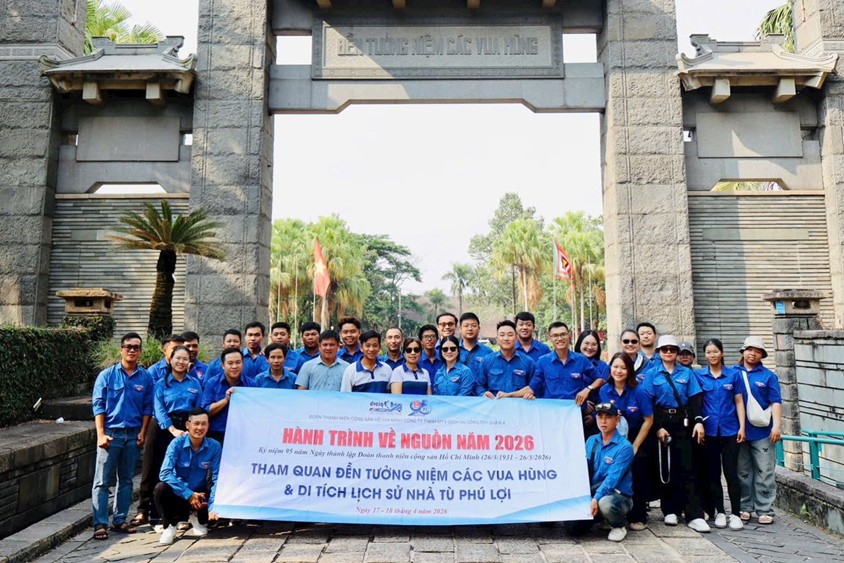 Trong hai ngày 17 – 18/4/2026, được sự đồng ý của Đảng ủy, Ban Giám đốc Công ty TNHH MTV Dịch vụ Công ích Quận 4, BCH Đoàn Thanh niên Công ty đã tổ chức Hành trình về nguồn cho toàn thể đoàn viên, thanh niên. Đây là hoạt động ý nghĩa thiết thực chào mừng Giỗ Tổ Hùng Vương (mùng 10/3 Âm lịch), kỷ niệm 95 năm Ngày thành lập Đoàn TNCS Hồ Chí Minh (26/3/1931 – 26/3/2026) và 51 năm Ngày Giải phóng miền Nam, thống nhất đất nước (30/4/1975 – 30/4/2026). 1. DÂNG HƯƠNG TẠI ĐỀN TƯỞNG NIỆM CÁC VUA HÙNG Điểm đến đầu tiên của hành trình là Đền Tưởng niệm các Vua Hùng tọa lạc tại Đường 16, phường Long Bình (Quận 9 cũ) – ngôi đền thờ Vua Hùng lớn nhất khu vực Nam Bộ, nằm trên ngọn đồi cao hơn 20m thuộc Công viên Lịch sử – Văn hóa Dân tộc rộng hơn 400ha. Công trình mang đậm nét kiến trúc truyền thống kết hợp hiện đại với quảng trường mô phỏng mặt trống đồng Đông Sơn, con đường tre xanh dài 360m gợi nhớ hồn quê Việt và 18 cột đá tượng trưng cho 18 đời Vua Hùng.