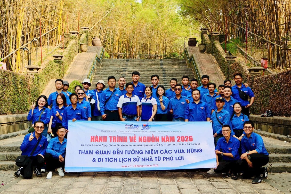 Trong hai ngày 17 – 18/4/2026, được sự đồng ý của Đảng ủy, Ban Giám đốc Công ty TNHH MTV Dịch vụ Công ích Quận 4, BCH Đoàn Thanh niên Công ty đã tổ chức Hành trình về nguồn cho toàn thể đoàn viên, thanh niên. Đây là hoạt động ý nghĩa thiết thực chào mừng Giỗ Tổ Hùng Vương (mùng 10/3 Âm lịch), kỷ niệm 95 năm Ngày thành lập Đoàn TNCS Hồ Chí Minh (26/3/1931 – 26/3/2026) và 51 năm Ngày Giải phóng miền Nam, thống nhất đất nước (30/4/1975 – 30/4/2026). 1. DÂNG HƯƠNG TẠI ĐỀN TƯỞNG NIỆM CÁC VUA HÙNG Điểm đến đầu tiên của hành trình là Đền Tưởng niệm các Vua Hùng tọa lạc tại Đường 16, phường Long Bình (Quận 9 cũ) – ngôi đền thờ Vua Hùng lớn nhất khu vực Nam Bộ, nằm trên ngọn đồi cao hơn 20m thuộc Công viên Lịch sử – Văn hóa Dân tộc rộng hơn 400ha. Công trình mang đậm nét kiến trúc truyền thống kết hợp hiện đại với quảng trường mô phỏng mặt trống đồng Đông Sơn, con đường tre xanh dài 360m gợi nhớ hồn quê Việt và 18 cột đá tượng trưng cho 18 đời Vua Hùng.