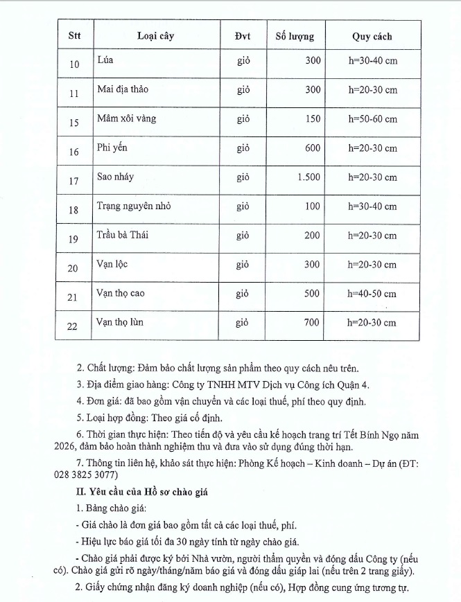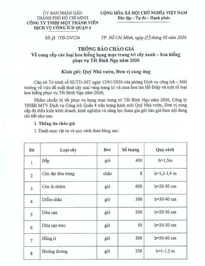 THÔNG BÁO CHÀO GIÁ V/v cung cấp các loại hoa kiểng hạng mục trang trí cây xanh – hoa kiểng phục vụ Tết Bính Ngọ năm 2026