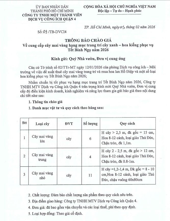 THÔNG BÁO CHÀO GIÁ V/v cung cấp cây mai vàng hạng mục trang trí cây xanh – hoa kiểng phục vụ Tết Bính Ngọ năm 2026