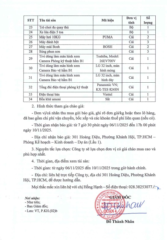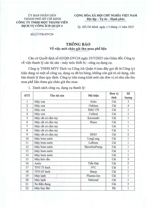 THÔNG BÁO - Về việc mời chào giá thu mua phế liệu