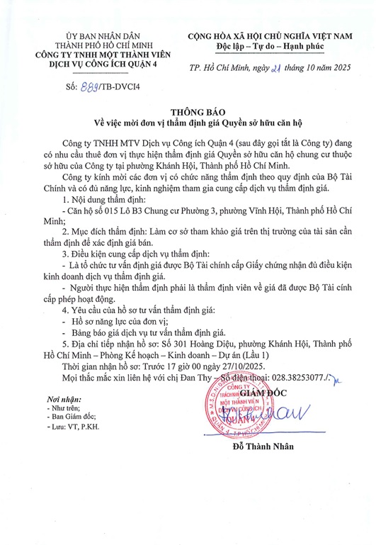 Thông báo v/v mời Thẩm định giá quyền sở hữu căn hộ 015 Lô B3 Chung cư Phường 3, phường Vĩnh Hội, Thành phố Hồ Chí Minh